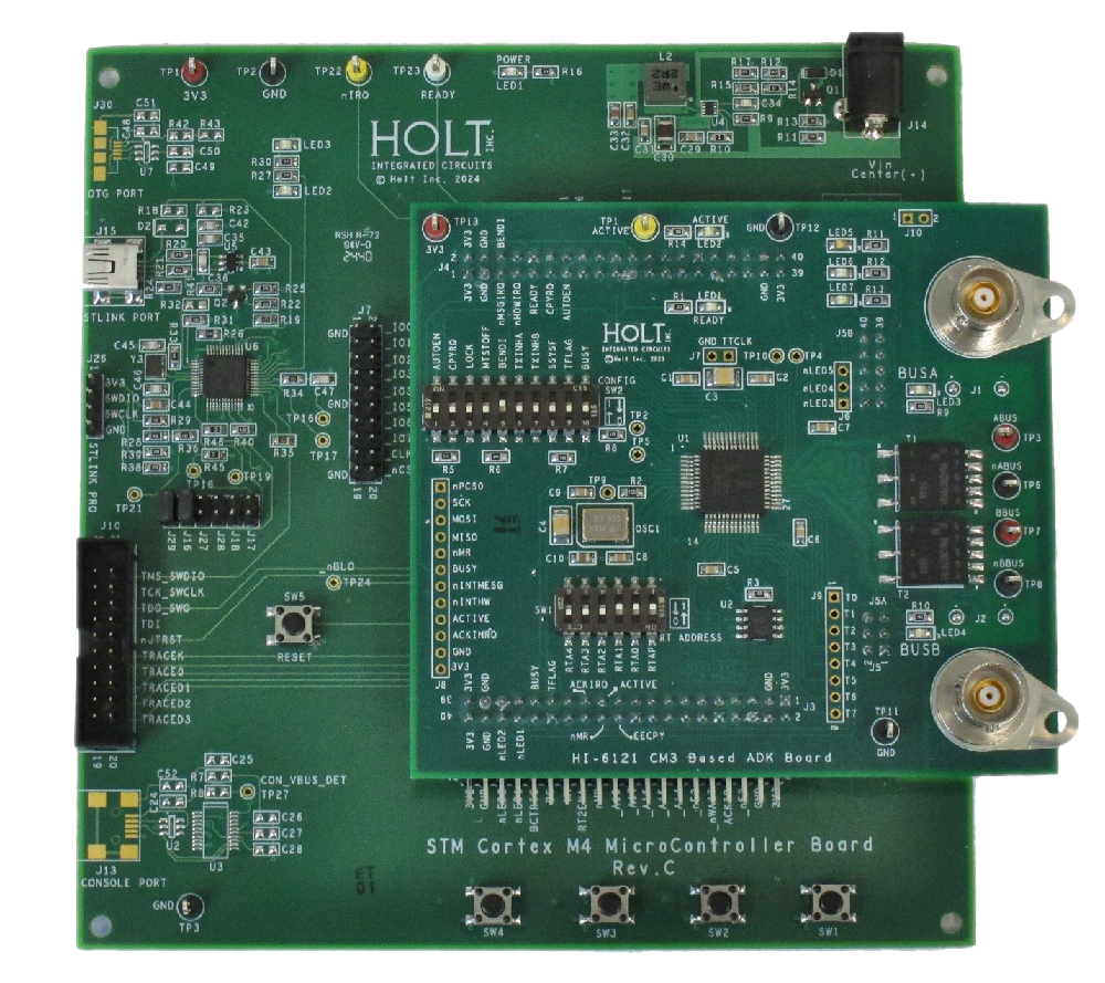The HI-612x family of MIL-STD-1553B bus communication devices contain highly effective protocol logic and physical bus interface circuitry. The 2-board assembly and bare metal demo C project reference design provides a ready-to-run evaluation platform demonstrating Remote Terminal functionality. For convenience, this kit includes project files for the STMicro STM32CubeIDE which provisions a fully integrated debug interface for the ARM Cortex STM32L4R5 microcontroller.